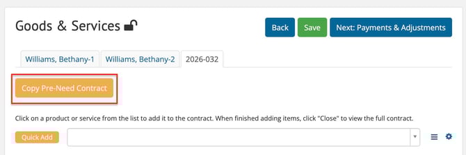 Convert pre-need cases to at-need and copy items from the contracts using Passare's copying feature.