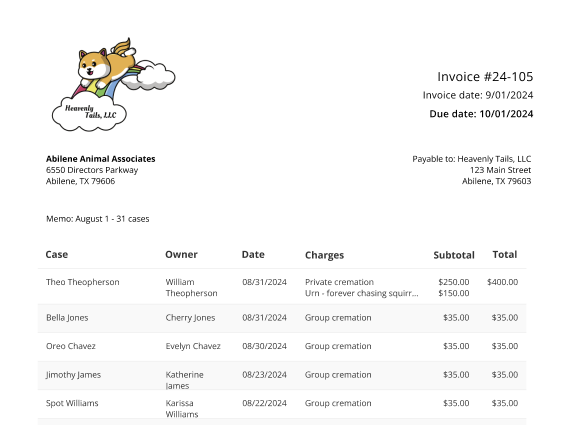 Invoicing allows funeral homes to consolidate multiple cases and charges into a single, clear, itemized invoice for easier billing