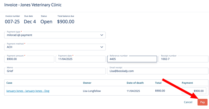 Edit payment details: payment method, payment amount, payment date, receipt number, email reciept.