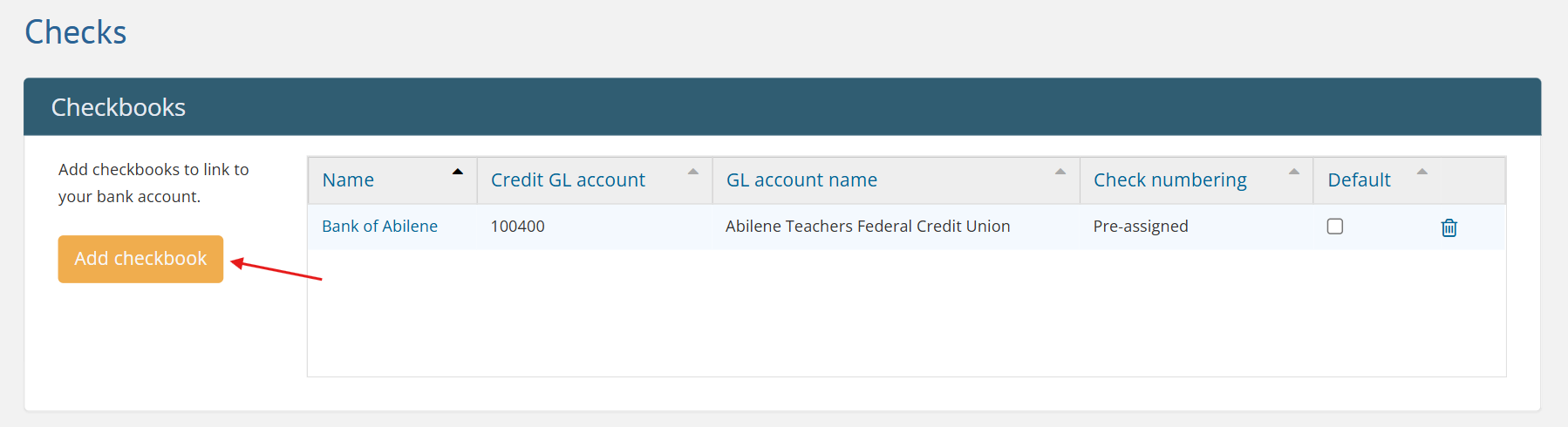 • Associated check transactions — transactions selected here are tied to specific GL codes and will appear as an option on checks written from this checkbook.